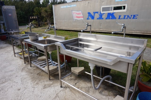 由於營地四周都是魚塘,為確保池水乾淨與環境衛生,這裡的水槽為集中式的設計。