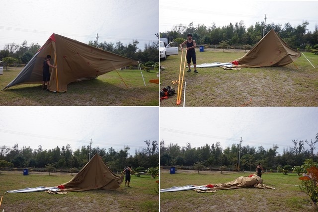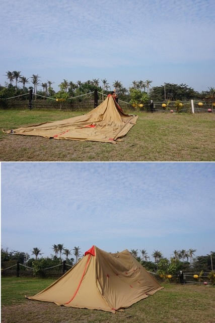 展開搭成半開式天幕搭法的雙峰帳,還得兼顧搭得漂亮搭得穩固又抗風...